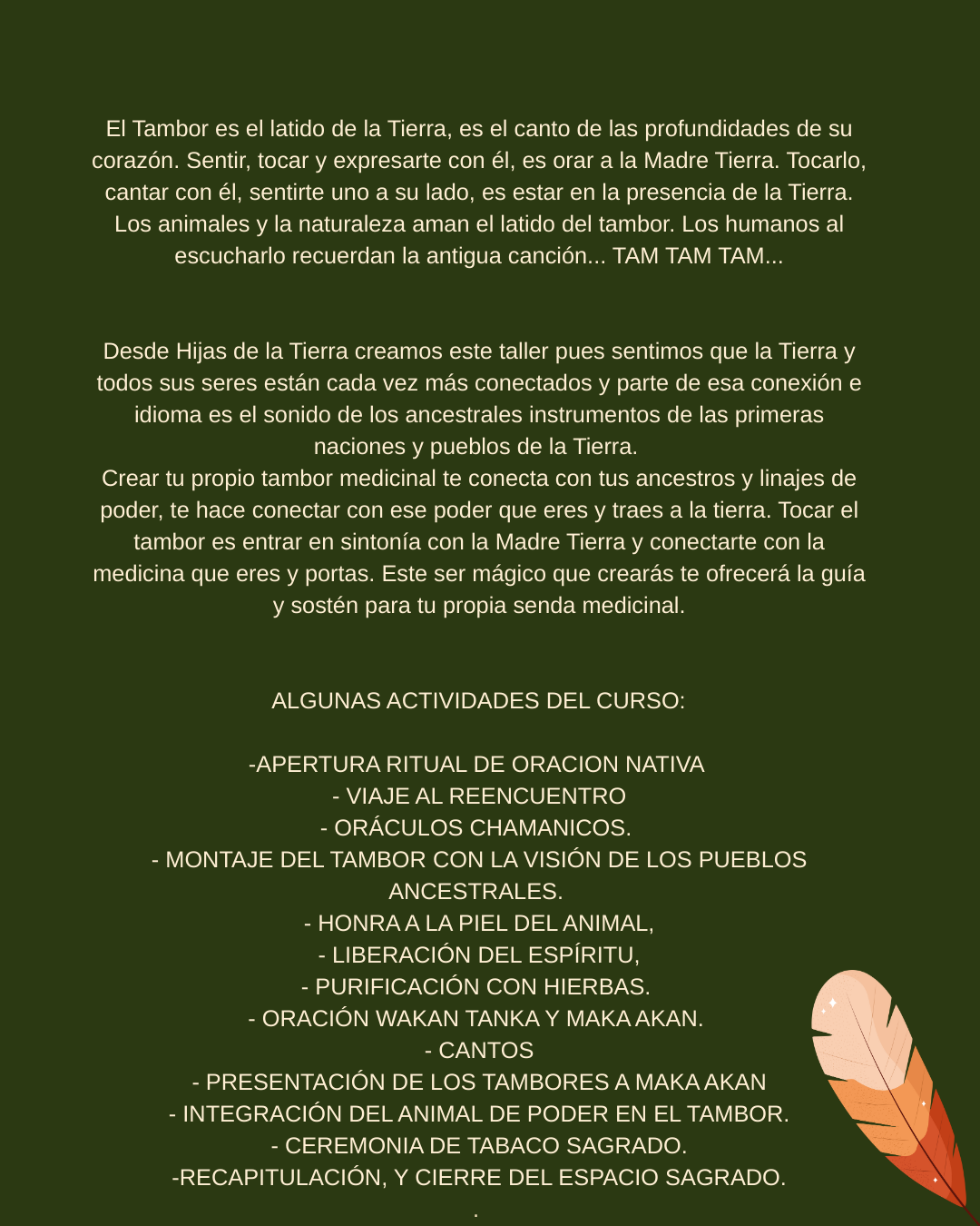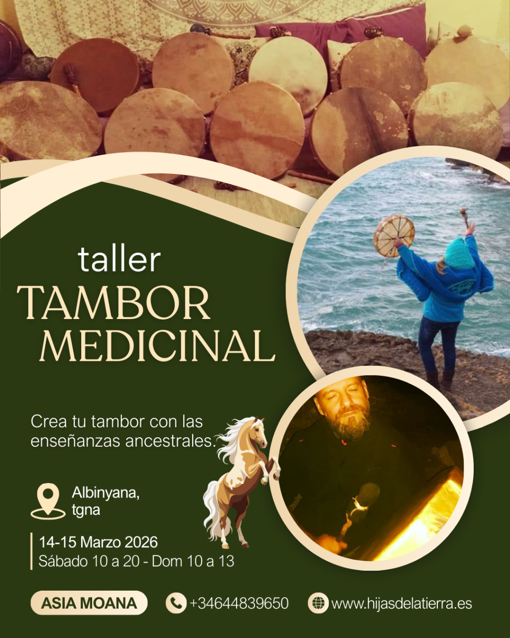 Desde Hijas de la Tierra creamos el taller CREA TU TAMBOR MEDICINAL pues sentimos que la Tierra y todos sus seres están cada vez más conectados y parte de esa conexión e idioma es el sonido de los ancestrales instrumentos de las primeras naciones y pueblos de la Tierra. Crear tu propio tambor medicinal te conecta con tus ancestros y linajes de poder, te hace conectar con ese poder que eres y traes a la tierra. Tocar el tambor es entrar en sintonía con la Madre Tierra y celebrar de una vez por todas que eres Hij@ de la Tierra, aquí y ahora!